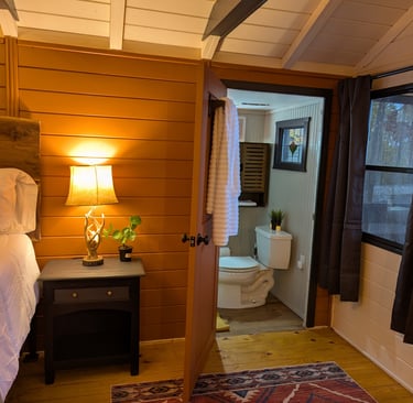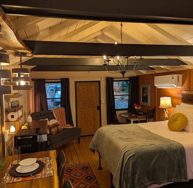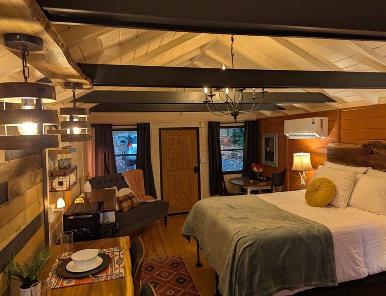 The cabin is part of the Black Mountain Stomping Grounds, a private sanctuary bordering conservation land. Though it feels like worlds away, you are only 15 minutes from downtown Black Mountain, where you can experience fine dining, galleries, concerts, and immerse yourself in an outdoor sports haven—a rare balance of wild solitude and mountain-town charm.